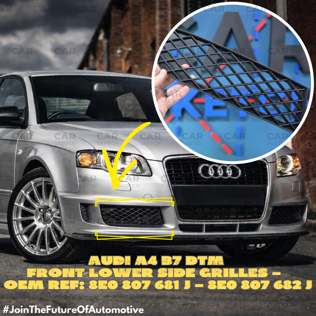 Αντικατάστησε ή αναβάθμισε τις εμπρός κάτω πλαϊνές γρίλιες του Audi A4 B7 DTM με αυτή την ποιοτική aftermarket λύση, σχεδιασμένη σύμφωνα με τη διάταξη του εργοστασιακού DTM προφυλακτήρα.